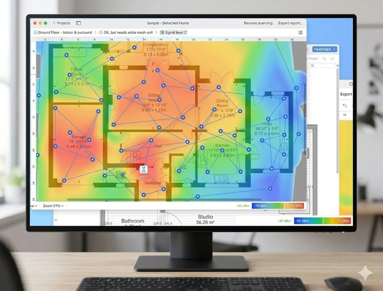 Avant toute installation, nous modélisons votre environnement en 3D pour simuler la propagation des ondes (Wi-Fi, LoRaWAN, 5G). Cette étape garantit un dimensionnement optimal et évite l'achat de matériel inutile.